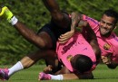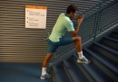 Nelle migliori foto sportive della settimana, per via della concomitanza fra Europei di nuoto e Giochi PanPacifici, c’è molta acqua. Dentro, ci trovate Michael Phelps – il fortissimo nuotatore statunitense che è tornato a gareggiare dopo due anni di pausa – durante la gara dei 200 misti. Fuori, appena prima di entrarci, qualche tuffatore in posizione curiosa. Altrove, c’è un ex calciatore molto famoso che non sembra molto soddisfatto di come gioca la propria squadra, e un tennista che invece appare molto rilassato, appena dopo aver vinto una partita (tanto che ha già in mano il suo cellulare). Poi, qualche giocatore di hockey con una divisa piuttosto appariscente e una lunga fila di ciclisti, quasi ordinata. Più le solite acrobazie.