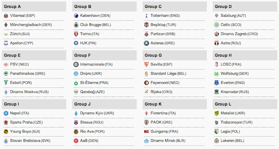 Il sorteggio di Europa League, la seconda competizione europea di calcio per importanza, si è tenuto stamattina alle 13 a Monaco: 48 squadre sono state estratte in 12 gironi da quattro ciascuna. Le prime due di ciascun girone passeranno ai sedicesimi di finale, la prima fase a eliminazione diretta, assieme alle terze classificate degli otto gironi di Champions League, il torneo di maggiore importanza (sorteggiati ieri). Le quattro italiane partecipanti al torneo sono Napoli, Fiorentina, Inter e Torino. La Fiorentina si è qualificata al torneo direttamente alla fase ai gironi perché arrivata quarta in Serie A, mentre Inter e Torino, arrivate quinta e settima – il Parma è stato escluso dalle coppe europee per questioni con il fisco italiano – hanno dovuto giocare alcune partite della fase preliminare. Napoli, Inter e Fiorentina erano in prima fascia, mentre il Torino era in terza.