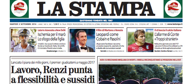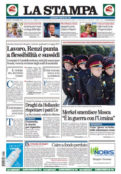 I quotidiani di oggi aprono tutti con la conferenza stampa di ieri del presidente del consiglio Renzi per presentare il programma dei mille giorni di governo e il sito lanciato per verificare l’attuazione del programma: i punti sui quali si concentra l’attenzione dei giornali sono la riforma del lavoro, con una maggiore flessibilità sul modello tedesco, e l’annuncio della conferma del bonus di 80 euro.