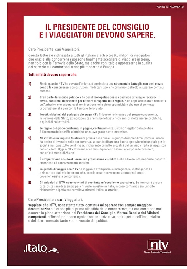 Su Repubblica e sul Corriere di oggi è stata pubblicata una pagina a pagamento di Nuovo Trasporto Viaggiatori, l’azienda dei treni ad alta velocità Italo. Il messaggio è indirizzato al presidente del Consiglio e ai clienti dell’azienda ed è una sorta di risposta alle notizie di crisi aziendale riprese da diversi giornali negli ultimi giorni. (E al vicepresidente del Senato Gasparri che su Twitter ha augurato all’azienda di chiudere, ed è stato poi querelato). Nel messaggio, in cui l’azienda rivendica i buoni risultati commerciali raggiunti fino a ora, si fa riferimento prevalentemente alla situazione di concorrenza tra NTV e l’ex monopolista dei trasporti ferroviari Trenitalia, concorrenza sleale che va avanti da molto, dice NTV, e si chiede un intervento del governo per ristabilire delle condizioni di libero mercato.