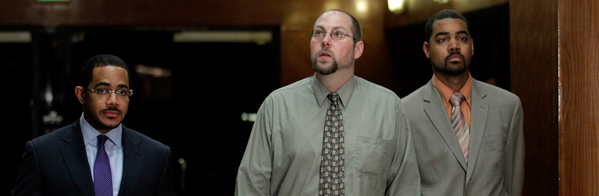 Christopher Chaney (al centro) prima di una conferenza stampa a Los Angeles, il 1 novembre 2011. (AP Photo/Jae C. Hong)