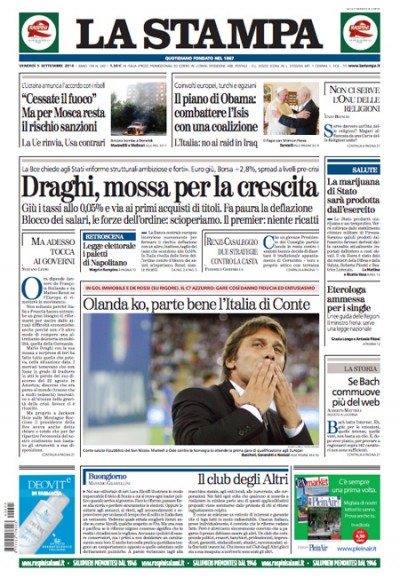 Sono due le notizie principali che si dividono le aperture sui giornali di oggi: la decisione della Banca Centrale Europea di ridurre ancora i tassi per favorire la ripresa economica, portando il costo del denaro allo 0,05%, e la minaccia di sciopero da parte dei sindacati della polizia dopo che il ministro della pubblica amministrazione Madia aveva comunicato ieri il blocco degli stipendi dei dipendenti statali anche per il 2015. Fanno eccezione il Manifesto e l’Osservatore Romano, che titolano sulla situazione in Ucraina e sul vertice NATO di ieri in Galles. I quotidiani sportivi si occupano della convincente vittoria dell’Italia sull’Olanda nell’esordio di Antonio Conte come allenatore dell’Italia.