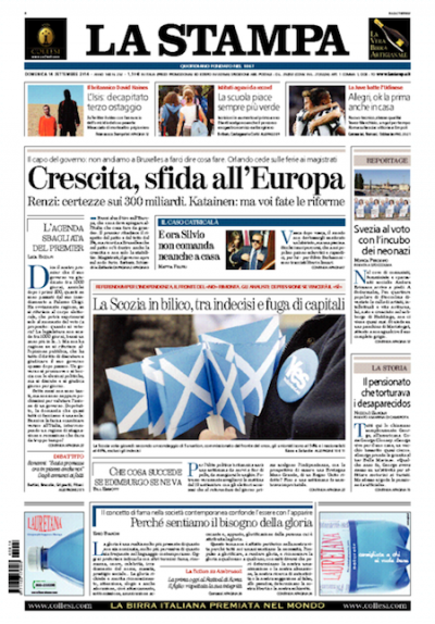 Corriere della Sera e Repubblica hanno scelto di mettere in apertura in prima pagina la notizia della decapitazione di David Haines, un cooperante britannico, da parte dello Stato Islamico. La Stampa dedica alla vicenda un boxino in alto a sinistra e apre con l’atteggiamento del governo di Matteo Renzi nei confronti delle politiche economiche europee. Avvenire e alcuni giornali locali mettono in prima pagina il Papa e un suo nuovo messaggio pacifista. I giornali sportivi raccontano le vittorie di Juventus e Roma rispettivamente contro Udinese ed Empoli. Spariglia il Secolo XIX, con una prima pagina interamente dedicata alla mostra sui pittori messicani Frida Kahlo e Diego Rivera, che apre a Palazzo Ducale a Genova il 20 settembre.