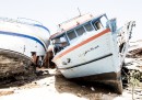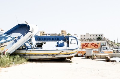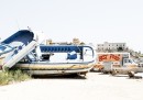 Un futuro possibile, che in parte è già presente, è sicuramente costituito dall’utilizzo del mare a scopi turistici, reso evidente dalla presenza di imbarcazioni adattate all’occorrenza, in parte anche per motivi comprensibili: il carburante qui è merce ancora più preziosa che altrove, dal momento che in nessun altro luogo raggiunge prezzi così alti, rendendo evidentemente molto più onerosa, e molto meno competitiva sul mercato, qualsiasi attività che non ne possa prescindere. E così perlomeno nei mesi “caldi” un ragguardevole numero di barche si trasforma, ospitando al suo interno teli mare e costumi coloratissimi indossati da gruppi eterogenei di persone che si regalano per un giorno un giro in barca dell’isola, in alcuni casi accompagnati da musica dal vivo, e comunque sempre rifocillati con grigliate a sorpresa: perché sarà il mare a decidere quali pesci finiranno nei loro piatti. Ma a Lampedusa anche il turista più scanzonato e desideroso di svago avrà sempre al suo ritorno in porto una visione impressionante nella sua verità: il cimitero di barche. Difficile immaginare qualcosa che più di questa presenza si caratterizzi come documento e monumento allo stesso tempo: è impossibile resistere alla necessità di avvicinarsi, e dopo qualche istante rimanere congelati sotto la luce secca, caldissima e bianca che avvolge questi scafi, che in maniera evidente recano su un fianco, a prua o altrove, i segni del momento in cui la navigazione ha iniziato a rendere ancora più vane le speranze di coloro che ci siamo abituati a chiamare “migranti”, nemmeno da troppo tempo.