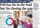 Due giorni fa il principale tabloid scozzese, il Daily Record, aveva pubblicato a tutta pagina “Il giuramento” firmato da David Cameron, primo ministro del Regno Unito, Ed Miliband, leader dei laburisti, e Nick Clegg, vice primo ministro e leader del partito liberal-democratico sulla concessione di nuovi e maggiori poteri e autonomie al governo scozzese se vincerà il “no”. Alex Salmond ha risposto a sua volta con una lettera pubblica in cui dice che con «lo storico voto» di domani «sarà in gioco il futuro del paese» e che ognuno avrà la possibilità di avere quel futuro «nelle sue mani»: «Non lasciate che questa opportunità scivoli dalle vostre dita». Salmond ha scritto inoltre che qualunque sarà l’esito del referendum la Scozia non sarà mai più la stessa», che le campagne sono ormai finite e che «ciò che rimane, siamo solo noi: le persone che vivono e lavorano qui». Il comitato per il “si” ha inoltre rivolto un appello alle donne che non hanno ricevuto sufficiente attenzione in questi ultimi anni dai principali partiti del Regno Unito. Sul Sun, invece, 14 ex capi delle forze armate hanno scritto che un voto a favore dell’indipendenza «indebolirebbe tutti noi»: «A rischio c’è l’alleanza di maggior successo della storia che ha visto uomini e donne di tutte le parti del paese fare la loro parte per garantire le libertà di cui oggi godiamo».