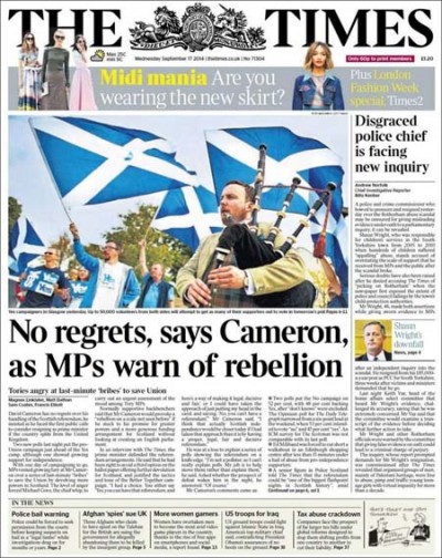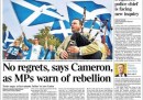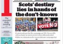 Le prime pagine dei giornali del Regno Unito e dei giornali scozzesi, oggi: c’è chi riporta i numeri degli ultimi sondaggi e chi racconta gli ultimi momenti di campagna elettorale. Il Telegraph racconta invece che il primo ministro scozzese Alex Salmond avrebbe fatto pressioni sulla rettrice della St Andrews University (la più riconosciuta e importante istituzione universitaria scozzese) per ottenere dichiarazioni a favore del suo governo e contro la politica del governo di Westminster.
