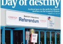 Tutte le prime pagine dei quotidiani britannici di oggi sono ovviamente dedicate al referendum sull’indipendenza della Scozia, che deciderà – alla fine di questa giornata – se il Regno Unito rimarrà unito oppure se perderà una delle sue nazioni. Alcuni giornali si sono espressi esplicitamente per il “sì” o per il “no”, come lo Scottish Daily Mail con un titolo lunghissimo: «È stato il fondamento dei nostri più grandi trionfi e ci ha unito durante le nostre ore più oscure. Oggi, assicuriamoci che il futuro della Scozia sia nella gloriosa e straordinaria famiglia delle nazioni che è la Gran Bretagna». Anche il conservatore Telegraph usa le parole del noto poeta e compositore scozzese Robert Burns per sostenere la causa dell’unità. Altri, almeno in copertina, hanno deciso di rimanere neutrali: come il Guardian, che titola «Il giorno del destino».