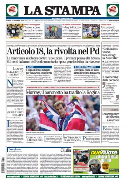 L’apertura dei giornali di oggi è dedicata a notizie diverse: la maggior parte si occupa dell’approvazione in commissione lavoro al Senato della bozza di testo del jobs act, che contiene le modifiche all’articolo 18 presentate dal governo, sulla quale nel PD c’è stata la protesta della minoranza. L’altra notizia in apertura su diversi giornali (soprattutto quelli più schierati con il centro destra, che tornano a parlare di giustizia a orologeria) è quella che riguarda il padre di Renzi, indagato a Genova per bancarotta fraudolenta, mentre dei quotidiani principali è solo il Corriere della Sera a tenere in apertura il referendum sull’indipendenza della Scozia, che pure occupa molto spazio su tutte le prime pagine.