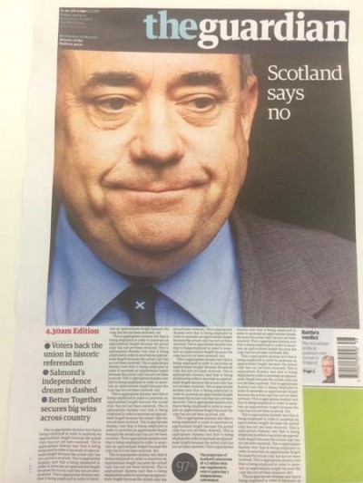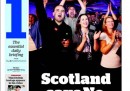 Durante la notte – e lo scrutinio delle schede del referendum sull’indipendenza della Scozia – i giornali britannici hanno pubblicato diverse edizioni: le prime con titoli vaghi e interlocutori, poi delle altre con i primi segnali a favore del no e poi queste, le edizioni finali, che danno la notizia della sconfitta degli indipendentisti.