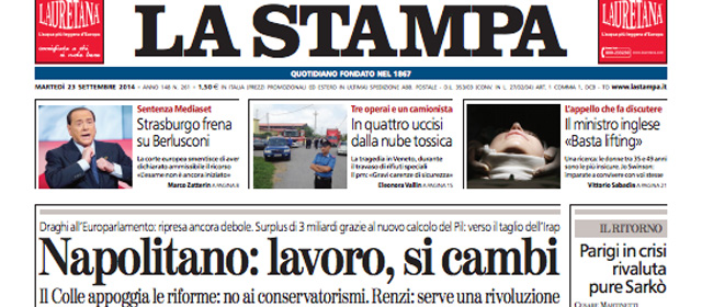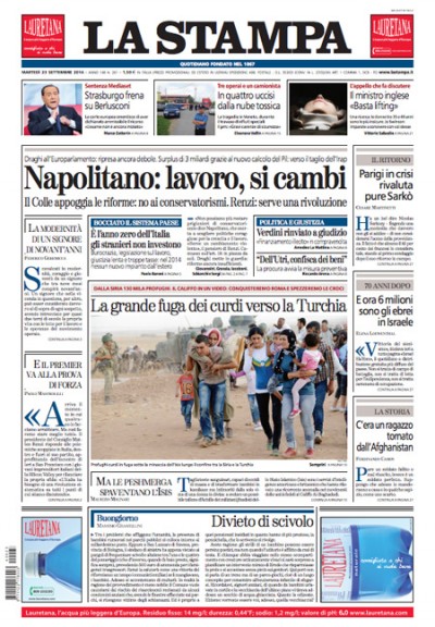 Il cammino del jobs act è anche oggi in apertura su quasi tutti i quotidiani nazionali, con gli interventi di ieri del Presidente della Repubblica Napolitano, che ha chiesto di rinunciare ai conservatorismi e di sostenere le riforme, e del Presidente del Consiglio Renzi, che dagli Stati Uniti ha annunciato un “cambiamento violento” per l’azione del suo governo. Il Manifesto apre invece sull’incidente sul lavoro a Adria che ha provocato la morte di quattro operai, mentre il Tempo si preoccupa delle minacce all’Italia dell’IS.