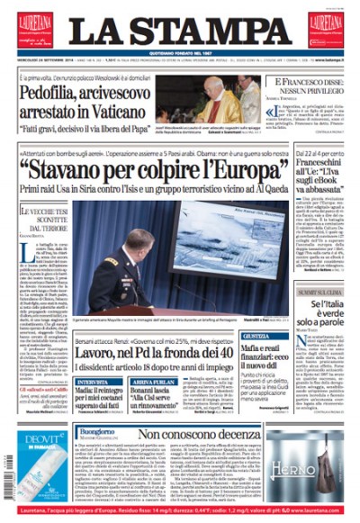 Le notizie con la quale aprono i quotidiani di oggi sono l’attacco lanciato dagli Stati Uniti con la collaborazione di cinque paesi arabi alle postazioni dell’IS in Siria, l’arresto in Vaticano dell’arcivescovo Wesolowski per pedofilia, e le divisioni all’interno del PD sulla riforma del lavoro, con la minoranza che ha presentato al Senato sette emendamenti per mantenere l’articolo 18.