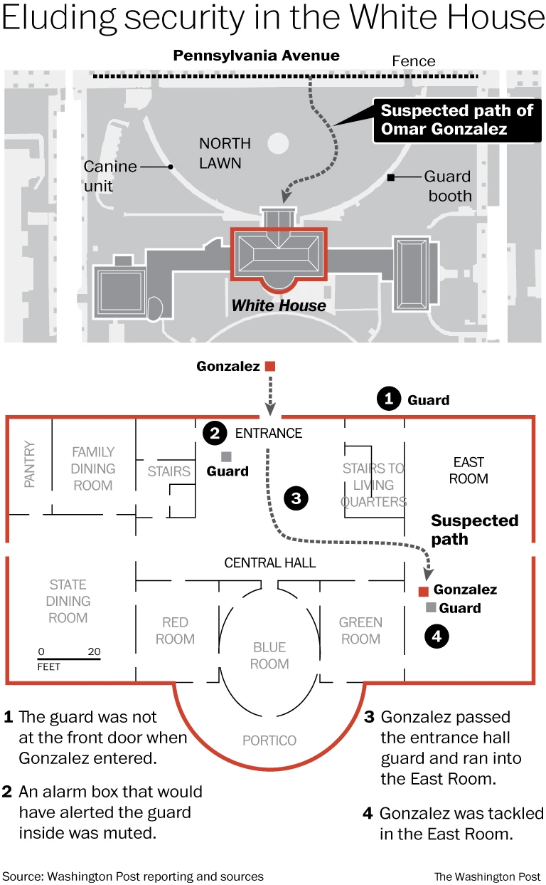 Un agente – che ha voluto rimanere anonimo – ha anche detto che l’allarme all’ingresso e all’interno della Casa Bianca (le cosiddette “crash boxes” che costituiscono una parte fondamentale nel sistema di sicurezza dell’edificio) era stato disattivato, ritardando gli interventi. In seguito, nella macchina di Gonzales parcheggiata poco lontano dalla Casa Bianca sono state trovate diverse armi. Gonzales è riuscito a eludere cinque diversi anelli di protezione tra il marciapiede pubblico e la porta di ingresso della Casa Bianca, e poi altri all’interno senza che venisse rispettata, come da protocollo, la procedura prevista in questi casi.