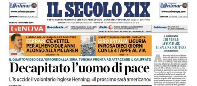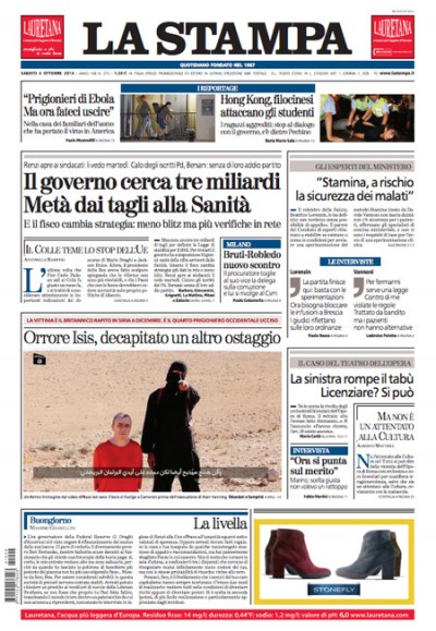 Le notizie in apertura sui giornali di oggi sono diverse: l’intervento del Presidente del Consiglio Renzi a Ferrara, durante il quale è stato contestato da un gruppo di esponenti del M5S, è in apertura su molti giornali, con l’annuncio dell’incontro di martedì prossimo con i sindacati e le critiche alle rigidità europee sul tetto del 3% per il deficit, ma molto spazio è dedicato anche al video diffuso dall’IS con l’uccisione dell’ostaggio inglese Alan Henning. Il Manifesto apre invece con il ricordo delle vittime del naufragio di Lampedusa nel primo anniversario, la Stampa si occupa della manovra economica del governo, mentre il Fatto titola sulle polemiche al tribunale di Milano fra Bruti Liberati e Robledo. I quotidiani sportivi presentano la partita di domani fra Juventus e Roma e annunciano il cambio di pilota alla Ferrari, con Alonso che lascia il posto a Vettel.