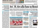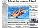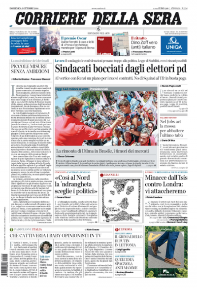 Oggi, i quotidiani a diffusione nazionale sono divisi sulla scelta della prima pagina fra tre temi di politica interna: la presunta abolizione dell’articolo 18 dello statuto dei lavoratori (La Stampa, Gazzetta del Mezzogiorno), lo spostamento di parte del TFR sul proprio stipendio (Repubblica, Messaggero), e il rapporto fra Partito Democratico e sindacati (Corriere della Sera, Manifesto). In molti boxini compare un’immagine presa da un video diffuso dall’ISIS, in cui viene mostrato un combattente britannico. I giornali sportivi si occupano estesamente della partita fra Juventus e Roma, le uniche due squadre a punteggio pieno in Serie A, che giocheranno contro questo pomeriggio alle 18.