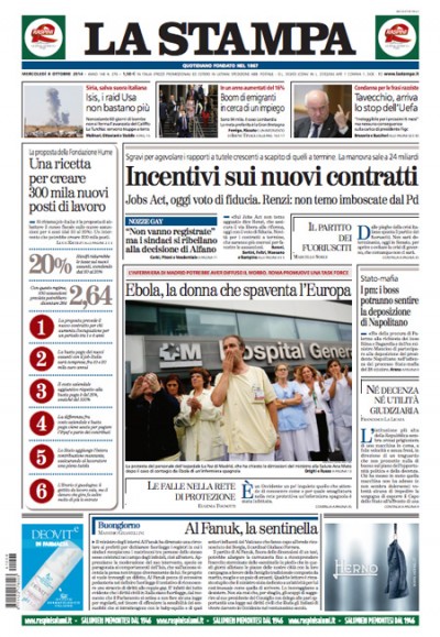 Sono due le notizie che si dividono l’apertura sui quotidiani di oggi: l’attesa per il voto previsto per oggi sulla fiducia posta dal governo al Senato sul maxiemendamento al jobs act, dopo che l’incontro con i sindacati di ieri sembra aver portato a delle piccole aperture, e la polemica fra il ministro dell’interno Alfano e i sindaci sulla registrazione nei registri comunali dei matrimoni omosessuali celebrati all’estero. Il Giornale si occupa invece della decisione dei pm del processo sulla trattativa fra Stato e mafia di consentire ai boss mafiosi di assistere all’interrogatorio del Presidente della Repubblica Napolitano, mentre Avvenire segue l’avanzata dell’IS in Siria.