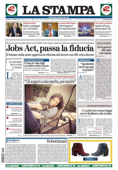 Tutti i giornali di oggi dedicano l’apertura al voto di fiducia del Senato sul jobs act, arrivato nella notte dopo una giornata di discussioni agitate e contestazioni in aula, e alle parole di approvazione sul provvedimento al vertice UE sul lavoro di Milano. Fa eccezione Avvenire, che titola sulla morte del primo paziente di ebola negli Stati Uniti.