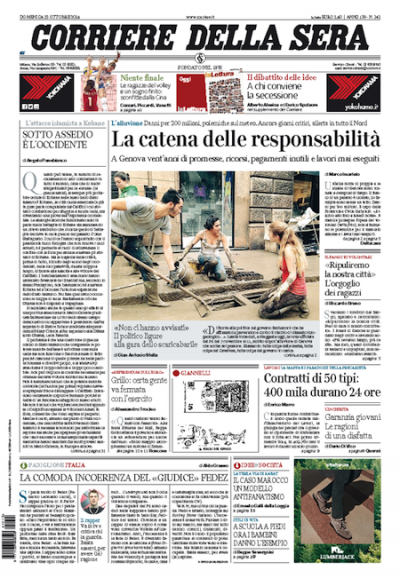 L’alluvione di Genova, a tre giorni di distanza, è ancora molto presente sulle prime pagine dei principali quotidiani a diffusione nazionale. Le dedicano l’apertura il Corriere della Sera, la Stampa, il Fatto Quotidiano e il Manifesto; fra gli altri, Repubblica apre con il discorso di Beppe Grillo al Circo Massimo e di Roma e una dichiarazione del ministro dell’Economia Pier Carlo Padoan, mentre il Messaggero, in prima pagina, anticipa alcuni nuovi provvedimenti economici del governo. Solo Avvenire, fra i quotidiani più diffusi, apre con una notizia di esteri: un reportage sull’avanzata dello Stato Islamico in Siria e Iraq. I giornali sportivi, in assenza dei campionati nazionali di calcio, ne parlano in maniera laterale con interviste e retroscena (l’eliminazione della nazionale italiana femminile ai Mondiali di pallavolo è finita nei boxini).