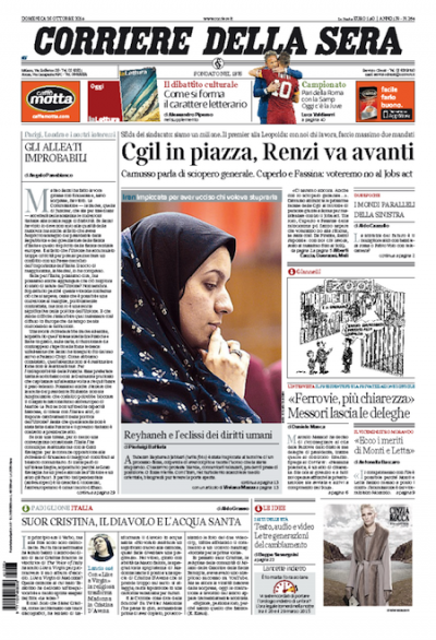 Tutti i principali quotidiani a diffusione nazionale aprono oggi con la manifestazione della CGIL a Roma contro il Jobs Act del governo di Matteo Renzi, impegnato invece nella quinta edizione della manifestazione della Leopolda a Firenze. Molti giornali scelgono inoltre di riprendere parti del comizio del segretario generale Susanna Camusso: uno dei passaggi più citati è quello in cui minaccia uno sciopero dei lavoratori. L’altra notizia che si trova un po’ ovunque è quella della morte di Reyhaneh Jabbari, la 26enne iraniana la cui condanna a morte per omicidio eseguita ieri – uccise un uomo che tentò di violentarla – è stata contestata da moltissime associazioni per i diritti umani. I giornali sportivi si occupano del pareggio della Roma in trasferta a Genova, contro la Sampdoria, per 0-0.