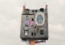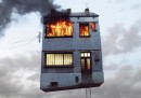Flying Houses è un progetto del fotografo francese Laurent Chéhère, nato a Parigi nel 1972: ogni immagine raffigura una casa che esiste realmente a Parigi, sospesa nel cielo tra le nuvole come fosse un aquilone. Chéhère ha iniziato il progetto nel 2007: da allora ha esplorato i quartieri multietnici di Belleville, Ménilmontant – dov’è nato – e Pigalle per prendere ispirazione dalle roulotte degli zingari, dalle case degli immigrati africani dai cinema erotici, dagli hotel decrepiti o dalle semplici e ordinate villette di periferia. Fotografava le case che lo colpivano di più e poi le modificava con Photoshop, accompagnando le immagini con nuovi dettagli: graffiti, insegne, poster cinematografici, muri scrostati, una coppia affacciata alla finestra, tutti particolari che incuriosiscono l’osservatore e lo invitano a immaginare una storia per quella casa e per le persone che ci abitano.