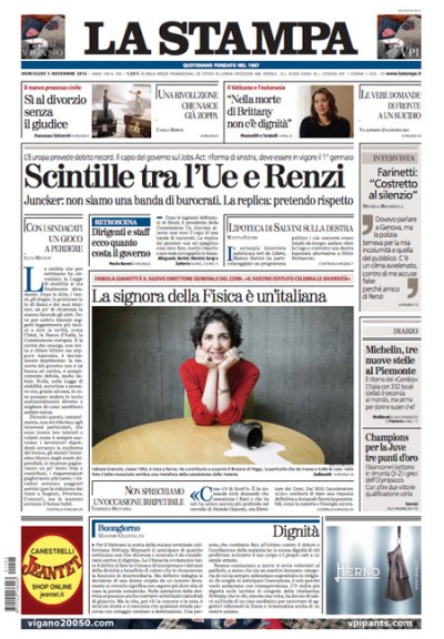 Tutti i quotidiani nazionali oggi dedicano l’apertura allo scontro fra il Presidente del Consiglio Renzi e il Presidente della Commissione UE Juncker: dopo le accuse di Renzi, ieri Juncker ha risposto di non essere a capo di una banda di burocrati, mentre l’Unione Europea ha rivisto le previsioni sul debito dei vari paesi, che in Italia raggiungerebbe una cifra record. I quotidiani sportivi titolano sulla vittoria della Juventus in rimonta sull’Olympiacos in Champions League.