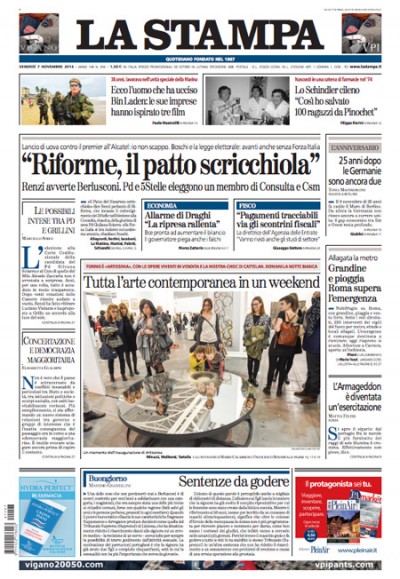La situazione politica italiana è in apertura su quasi tutti i giornali di oggi, che si occupano delle dichiarazioni del Presidente del Consiglio Renzi, che ha detto ieri che il patto del Nazzareno con Forza Italia “scricchiola”, sottolineando anche l’intesa fra PD e M5S per l’elezione di Silvana Sciarra a giudice della Corte Costituzionale. Il Manifesto titola invece sull’allarme dell’OCSE sulla mancata crescita economica dei paesi europei, il Messaggero e il Tempo aprono sulle polemiche a Roma sull’allarme per il maltempo, e i quotidiani sportivi si occupano dei risultati delle squadre italiane in Europa League.