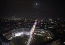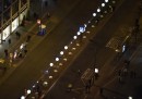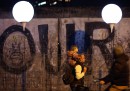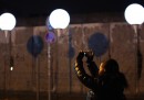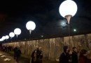 La Caduta del Muro di Berlino, avvenuta esattamente 25 anni fa, è celebrata in questi giorni a Berlino con un’iniziativa inaugurata venerdì sera: si tratta di un’imponente installazione chiamata “I Confini della Luce”, progettata in occasione dell’anniversario della Caduta del Muro di Berlino. In pratica, una lunghissima fila composta da circa 8 mila palloncini bianchi è stata sistemata nei principali quartieri e vie di Berlino lungo il perimetro del Muro che ha diviso la città fino al 9 novembre 1989. I palloncini sono gonfiati con elio e illuminati internamente da un LED, e agganciati in cima a un supporto: somigliano a una specie di lampioni flessibili e resteranno illuminati fino a domenica. Poi, domenica 9, giorno dell’anniversario della caduta del Muro, saranno sganciati dal loro supporto e liberati in cielo. All’inaugurazione era presente anche il sindaco Klaus Wowereit.