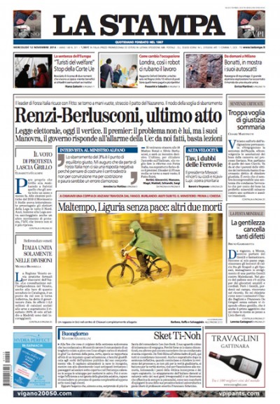 La notizia di apertura per quasi tutti i quotidiani nazionali di oggi è il cammino della legge elettorale, dopo la riunione dei vertici di Forza Italia di ieri nella quale il partito si è ricompattato sulla posizione di Silvio Berlusconi e in attesa dell’incontro di oggi fra Berlusconi e Renzi. Il Corriere della Sera titola invece sugli emendamenti alla legge di stabilità in discussione alla Camera riguardanti il trattamento fiscale del TFR in busta paga, mentre il Fatto, il Manifesto e il Secolo XIX si occupano del maltempo che ha provocato due morti in Liguria.