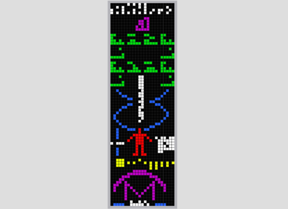 Quando gli 1 e gli 0 della stringa binaria vengono sistemati su una griglia di questo tipo, il risultato è una specie di sommario pixellato della storia dell’umanità diviso in sette parti. La prima mostra i numeri da uno a dieci. Nella seconda ci sono i numeri atomici di carbonio, idrogeno, ossigeno, azoto e fosforo. Segue un’immagine stilizzata di un essere umano, una rappresentazione della Terra all’interno del sistema solare – con Plutone mostrato come pianeta, una questione su cui ci sono ancora alcuni dibattiti – e un’immagine del telescopio di Arecibo che, ad un occhio del 2014, sembra probabilmente il logo di Gmail.