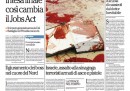 Sono due le notizie che si dividono le aperture dei principali quotidiani di oggi: l’attentato di Gerusalemme, dove due terroristi palestinesi armati di coltelli e pistole hanno assaltato una sinagoga uccidendo cinque israeliani, e il voto in Commissione Lavoro alla Camera con il quale è stato approvato l’emendamento presentato dal governo sul Jobs Act, che reintroduce il reintegro per alcune fattispecie di licenziamenti disciplinari. Il Giornale e Libero titolano invece sugli scontri a Milano durante lo sgombero di case occupate, mentre il Tempo e Europa si occupano della vicenda delle multe del sindaco di Roma Marino.