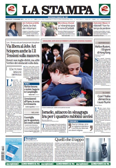 Sono due le notizie che si dividono le aperture dei principali quotidiani di oggi: l’attentato di Gerusalemme, dove due terroristi palestinesi armati di coltelli e pistole hanno assaltato una sinagoga uccidendo cinque israeliani, e il voto in Commissione Lavoro alla Camera con il quale è stato approvato l’emendamento presentato dal governo sul Jobs Act, che reintroduce il reintegro per alcune fattispecie di licenziamenti disciplinari. Il Giornale e Libero titolano invece sugli scontri a Milano durante lo sgombero di case occupate, mentre il Tempo e Europa si occupano della vicenda delle multe del sindaco di Roma Marino.