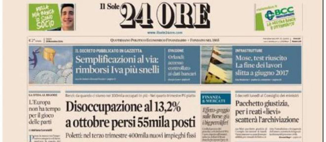 Sono diverse le notizie in apertura sui quotidiani di oggi: molti si occupano della decisione di Beppe Grillo di nominare un direttorio per il Movimento 5 Stelle composto da cinque deputati, altri aprono con i nuovi dati dell’ISTAT sulla disoccupazione, che a ottobre ha toccato un nuovo record, altri ancora cedono all’allarmismo sulla vicenda del vaccino antinfluenzale, dopo alcune morti che potrebbero essere collegate al vaccino stesso, altri ancora titolano sulla visita di Papa Francesco in Turchia, mentre il Corriere della Sera apre con un’intervista a Silvio Berlusconi.