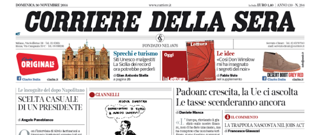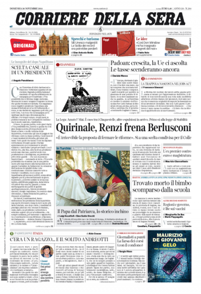 Molti quotidiani a diffusione nazionale, oggi, hanno scelto di aprire con le trattative fra il presidente del Consiglio Matteo Renzi e Silvio Berlusconi sulla successione di Giorgio Napolitano: se ne occupano il Corriere della Sera, Repubblica, il Messaggero e il Mattino. La Stampa, invece, sceglie di aprire con il nuovo dato sulla disoccupazione, che spiega essere il peggiore «di tutta la nostra storia». Il Fatto Quotidiano dedica la prima pagina, invece, alle agitazioni nel Movimento 5 Stelle, all’interno del quale dovrebbero avvenire presto nuove espulsioni. I giornali sportivi si dedicano in particolare a due partite di oggi: il derby fra Juventus e Torino e Roma-Inter, che si giocheranno rispettivamente alle 18 e alle 20.45.