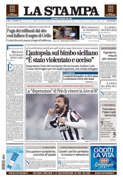 I giornali di oggi hanno notizie diverse in apertura: molti si occupano di cronaca, con le indagini sulla morte del bambino di 8 anni in provincia di Ragusa, il Corriere della Sera titola sui risultati di un sondaggio che vede in calo la fiducia nei confronti di Matteo Renzi, altri giornali, soprattutto locali, aprono con i risultati delle primarie del centrosinistra in Veneto e in Puglia, vinte da Alessandra Moretti e Michele Emiliano, altri ancora rimangono su notizie di politica interna, dalle riforme del governo alle voci sul nuovo Presidente della Repubblica, mentre i quotidiani sportivi si occupano delle vittorie della Juventus nel derby di Torino e della Roma contro l’Inter.