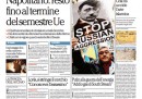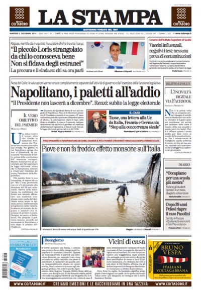 Ci sono notizie diverse in apertura sui quotidiani di oggi: molti si occupano della situazione politica, con il comunicato della Presidenza della Repubblica che ha escluso che le dimissioni del Presidente Napolitano possano arrivare prima della chiusura del semestre italiano di presidenza europea e l’intervento di Matteo Renzi alla direzione del PD, che ha chiesto un’accelerazione nell’approvazione delle riforme. Altri rimangono sulla cronaca, con le indagini per la morte del bambino di 8 anni in provincia di Ragusa e la vicenda dei vaccini antiinfluenzali, mentre il Corriere della Sera analizza il calo del PIL nell’ultimo anno.