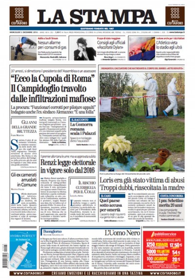 L’apertura di tutti i quotidiani di oggi è dedicata all’inchiesta di Roma sui rapporti fra criminalità e politica, che ha portato ieri a 37 arresti e vede indagato, fra gli altri, anche l’ex sindaco Alemanno. Altre notizie presenti su molte prime pagine sono le indagini sulla morte del bambino di 8 anni in provincia di Ragusa, e la testimonianza del comandante Schettino al processo sull’incidente della nave Costa Concordia.