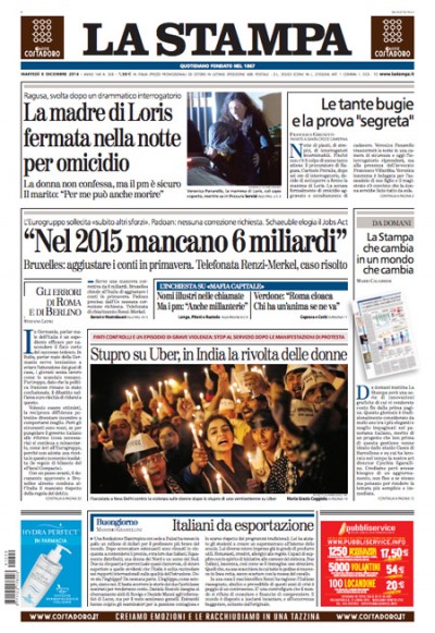 Quasi tutti i giornali di oggi hanno cambiato la propria prima pagina per aggiornarla con la notizia arrivata nella notte del fermo per omicidio della madre del bambino ucciso in provincia di Ragusa, deciso dal magistrato dopo un lungo interrogatorio. Chi non ha fatto in tempo, si occupa ancora dell’indagine di Roma sui rapporti fra criminalità e politica, o della sollecitazione dell’Eurogruppo all’Italia di maggiori sforzi per la riduzione del deficit, mentre i quotidiani sportivi aprono con la presentazione della partita di stasera fra Juventus e Atletico Madrid, decisiva per la qualificazione al secondo turno di Champions League.