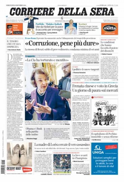 Le indagini sulla madre di Loris Stival, il bambino ucciso a Santa Croce Camerina, in Sicilia, continuano a impegnare i titoli di molte prime pagine, ma ci sono diverse altre notizie in evidenza: il rapporto sulle torture della CIA negli anni di Bush, le elezioni anticipate del capo dello Stato in Grecia, le intenzioni del governo sulla corruzione e la qualificazione della Juventus agli ottavi di finale di Champions League.
