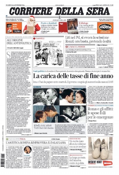I titoli sulle prime pagine dei principali quotidiani di domenica 14 dicembre sono quasi tutti dedicati a una serie di emendamenti alla cosiddetta Legge di Stabilità – le norme e i provvedimenti che determinano quali spese potranno essere affrontate dallo Stato – presentati in commissione Bilancio al Senato. Si parla di un emendamento che bloccherebbe l’aumento delle tasse sulla casa nel 2015 e l’innalzamento dell’aliquota per la Tasi al 6 per mille. Su molti giornali viene dato spazio in prima pagina anche ad alcuni contrasti interni nel Partito Democratico, in vista dell’assemblea che si terrà oggi a Roma. I quotidiani sportivi dedicano le prime pagine alle partite del campionato di calcio di Serie A che si giocheranno domenica.