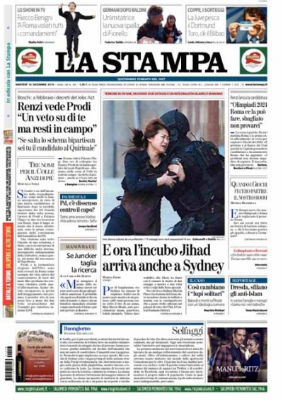 Il presidente del Consiglio Matteo Renzi lunedì ha detto una cosa e ne ha fatta un’altra, ed entrambe si spartiscono i titoli di prima pagina di oggi insieme con il sequestro di Sydney: Renzi ha candidato Roma (e l’Italia) a organizzare e ospitare le Olimpiadi estive del 2024 e ha incontrato Romano Prodi a Palazzo Chigi innescando tutta una serie di ipotesi e discussioni sul successore di Giorgio Napolitano alla presidenza della Repubblica. Gli unici a non essere sfiorati da questa discussione, oltre che parzialmente i giornali locali, sono i quotidiani sportivi presi dal sorteggio di Champions League ed Europa League, dal calciomercato e dai posticipi della Serie A.