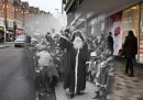 Il fotografo britannico Peter Macdiarmid, dell’agenzia Getty Images, ha recentemente prodotto una serie di 11 fotografie scattate a vie, piazze e negozi storici di Londra sulle quali ha sovrapposto alcune foto di archivio risalenti alla prima metà del secolo scorso. La bravura di Macdiarmid è stata quella di fotografare nelle settimane scorse, dalla stessa angolatura, gli stessi posti di Londra che aveva individuato nelle foto di archivio: il risultato è una specie di cornice del tempo presente, che racchiude una foto in bianco e nero di cosa c’era in quello stesso posto parecchie decine di anni fa.