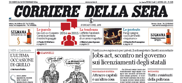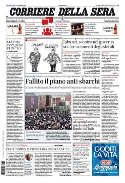 Sulle prime pagine dei principali quotidiani a diffusione nazionale si parla ancora di Jobs Act: la Stampa, Repubblica e il Messaggero raccontano nella notizia di apertura che la riforma del lavoro non sarà valida per i dipendenti pubblici, e riportano le relative polemiche. Il Corriere della Sera apre invece con un’analisi sugli sbarchi provenienti dall’Africa degli ultimi due mesi. Molti giornali, in posizioni diverse, riportano la foto di Mehmet Ali Ağca, un uomo turco che nel 1981 sparò tre colpi di pistola verso Papa Giovanni Paolo II e che ieri ha visitato la sua tomba. I giornali sportivi si occupano dello scambio fra Milan e Atletico Madrid dei calciatori Fernando Torres e Alessio Cerci.
