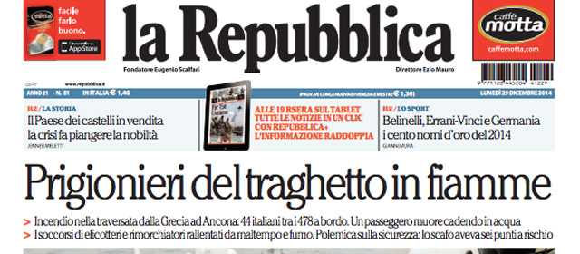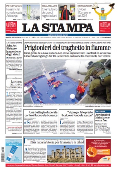 La notizia di apertura su tutti i quotidiani di oggi è l’incendio che si è sviluppato ieri mattina sul traghetto Norman Atlantic, in viaggio fra la Grecia e l’Italia, e le operazioni per salvare le persone rimaste bloccate sulla nave, rese difficili dalle condizioni del mare. A questa notizia molti giornali associano la scomparsa di un aereo in Indonesia con 162 persone a bordo, e l’incidente fra due navi turche davanti alla costa di Ravenna.