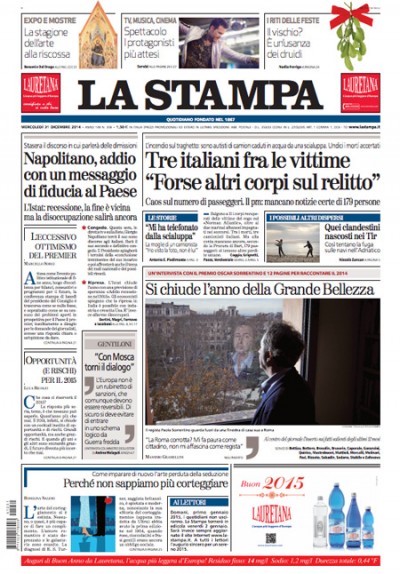 Quasi tutti i quotidiani di oggi rimangono in apertura sull’incendio sul traghetto Norman Atlantic, concentrandosi sui numeri dei morti e dei dispersi, sui quali ancora non c’è chiarezza per la possibile presenza di passeggeri clandestini a bordo della nave. Le altre notizie presenti sulle prime pagine sono l’attesa per il discorso di fine anno di stasera del Presidente della Repubblica Napolitano, l’ultimo prima delle sue annunciate dimissioni (in apertura sul Giornale, soddisfatto che sia l’ultimo), e i dati dell’ISTAT su recessione e disoccupazione, sui quali apre il Manifesto.