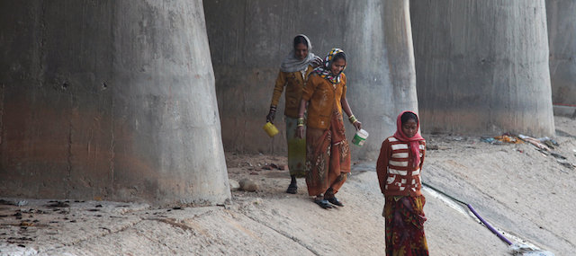 Tre donne reggono i recipienti di acqua da loro usati per lavarsi dopo aver defecato all’aperto sotto un ponte nella periferia di Jammu, in India, il 19 novembre 2014.