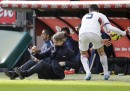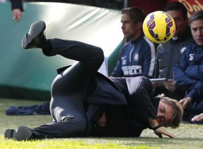 È successo dopo un passaggio sbagliato di un difensore: l'allenatore dell'Inter si è rialzato poco dopo, tutto intero