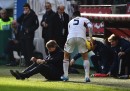 Roberto Mancini cade colpito da una pallonata durante Inter-Genoa
