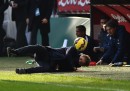 Durante la partita di Serie A fra Inter e Genoa giocata oggi a Milano, l’allenatore dell’Inter Roberto Mancini è caduto dopo aver preso una pallonata in faccia durante un’azione di gioco. Mancini si trovava nella parte di campo fra la panchina e il campo, ed è caduto all’indietro dopo che lo ha colpito un passaggio sbagliato del difensore Marco Andreolli. Mancini si è rialzato poco dopo, tutto intero.
