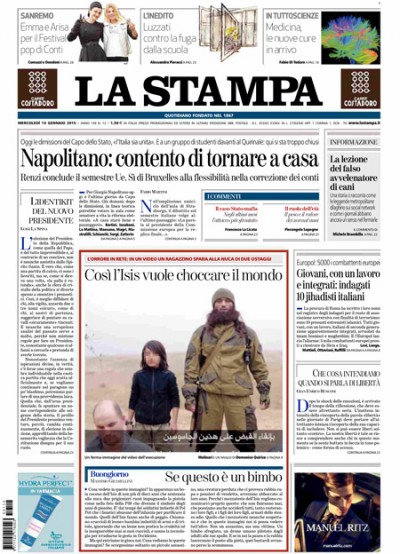 Sono due le notizie che si dividono oggi l’apertura dei principali quotidiani: le indagini in tutta Europa sul terrorismo islamico e i possibili rischi anche in Italia, e la chiusura del semestre europeo di presidenza italiana e le conseguenti dimissioni del Presidente della Repubblica Napolitano, previste per oggi. Il Fatto titola invece sul nuovo numero di Charlie Hebdo, in vendita da oggi insieme al quotidiano, mentre il Manifesto apre con un’intervista a Alexis Tsipras a pochi giorni dalle elezioni in Grecia.