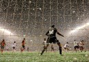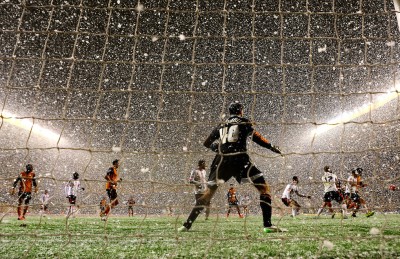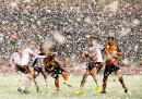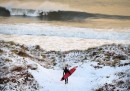 Fotografie dal Regno Unito durante le grandi nevicate di questi giorni: una partita di calcio, un castello bianco confuso nel paesaggio e persino un surfista