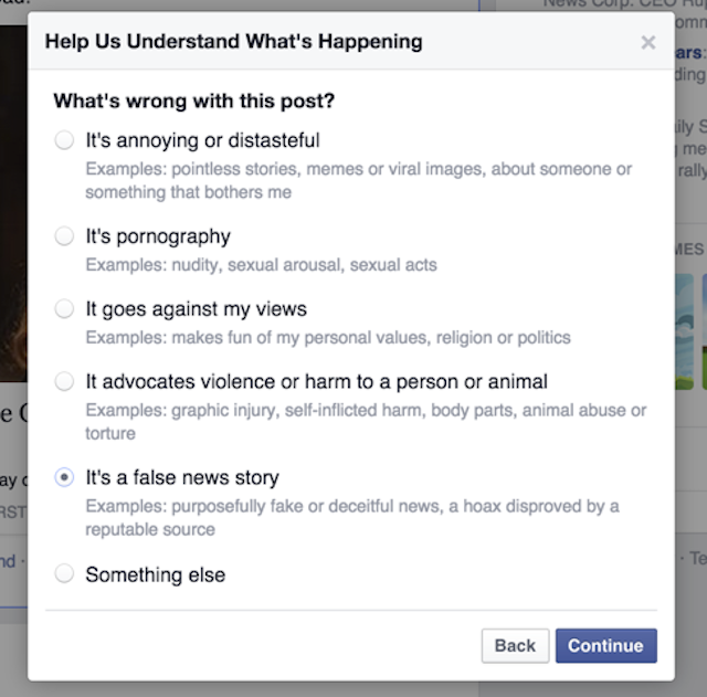Recentemente abbiamo aggiunto un’opzione per permettere agli utenti di segnalare come “falsa” una storia che vedono circolare sul proprio flusso di notizie. Funziona nello stesso modo in cui si riporta un tentativo di spam. Quando un certo utente sceglie di nascondere un contenuto dal proprio flusso, cliccando su una spunta in alto a destra di un post, può anche scegliere di dire a Facebook per quale motivo voglia farlo. Ora si può segnalare che un certo post contiene una “notizia falsa”.